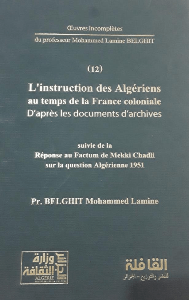 1 – L’instruction des Algériens au temps de la France coloniale d’après les documents d’archives suivie de la “Réponse au Factum de Mekki Chadli Sur la question Algérienne 1951”.Alger, les Éditions AL KAFILA 2014- Düsseldorf, les éditions Universitaires européennes, Février 2018